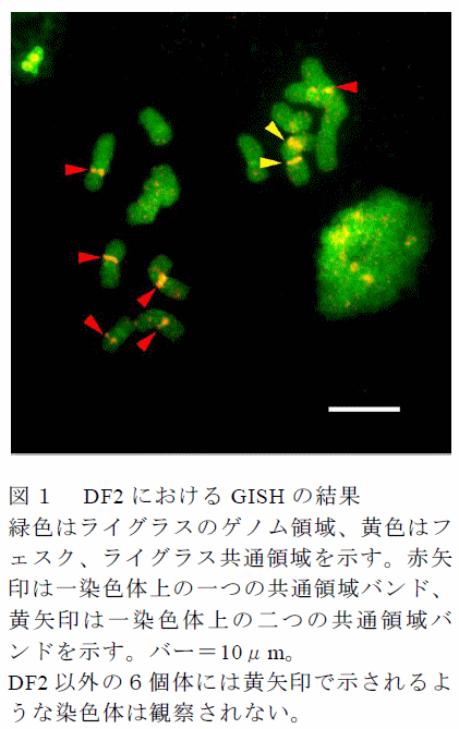 - ゲノミックin situハイブリダイゼーション(GISH)法によるゲノム解析の結果、DF1からDF7ではフェスク特異的染色体領域は検出されない。フェスク(赤色)とライグラス(緑色)の両方に共通な領域は、染色体上に黄色のバンドとして検出される。DF2のみ、黄色のバンドを二本持つ染色体が観察される(図1)。