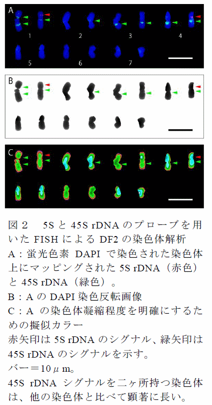 - DF2における二つの45S rDNAサイトを持つ染色体は他の染色体よりも長く、異常な染色体組換え、染色体断片の転座または挿入によって染色体構造が変異している(図2)。5S、45S rDNAは相同染色体の有無にも差がある。
