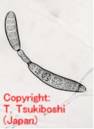 Morphology: Teleomorph: Unknown Anamorph: On olive brown to brown conidiophores, producing conidia straight or curved, pale brown to olive brown, fusiform, 30-100 x 12-19 um, with 3-8 pseudosepta. Germinated conidium often produces a secondary conidium. |