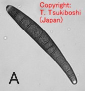 Morphology: Teleomorph: Unknown Anamorph: On dark olive brown conidiophores, producing conidia straight or slightly curved, dark olive brown, fusiform, slightly tapering to the tip, the end cells sometimes paler, 30-155 x 10-27 um, with 2-10 pseudosepta. |