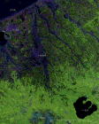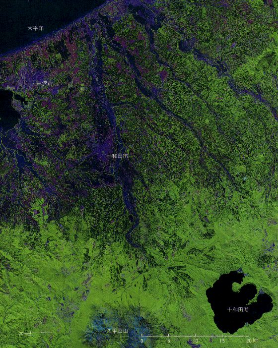 さて画像は,しばしばヤマセに襲われる南部地方の6月中旬の様子を示している。(この画像が撮られた1985年は冷害年ではなかった)。画像中で赤紫色の部分は市街地もしくは裸地である。十和田市の南を流れる奥入瀬川の中・下流域を中心に濃紺色の部分が水田である。奥入瀬川の南側は丘陵地の占める割合が多くなり,これに伴い水田地帯はますます細く狭くなり,相板川,馬淵川など流路に沿って帯状に分布している。しかし6月のこの時期,若い稲はまだ水田面を覆うに至っていない。