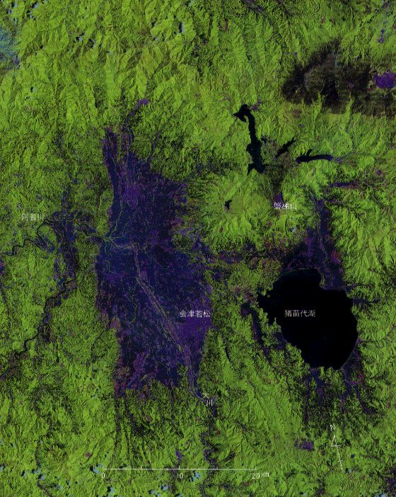 会津地方の総面積は,5.5千平方キロで福島県の40%をしめるが,耕地面積はその7%の41.6千ヘクタールであり,その80%が水田である。画像が観測された6月16日は,田植えの一ヶ月後なので,湛水された水田は黒色に見え,画像左側の会津盆地,右側の猪苗代湖周辺の平坦地は,ほとんど水田であることがよくわかる。