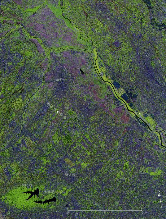 画像では,青紫色に表示されている市街地が,右上部に斜めに延びるJR東北本線,国道4号線沿いに集積している。市街地形成の進んだ与野市,浦和市に比べて画像中央部やや下の入間地域にはまだ多くの農地が残されている。画像上方から右下に流下する荒川の上流部では,流路周辺に多くの耕地が識別され,河川敷の緑地帯とともに首都圏の主要な農業生産および緑地空間を提供している。また,画像左側には入間川流域の茶畑地帯が広がっている。荒川との間に西から東へゆるやかな勾配をもって広がる台地は,江戸時代に新田開拓事業が行われたところで,列居型開拓村とその農地が今も面影をとどめている。画像の下方,所沢市の南部には東京の水がめといわれる狭山湖・多摩湖が位置している。