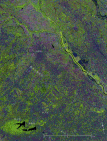 画像の中央部では,関越自動車道に分断されているものの,武蔵野新田集落の景観が画像上のパターンとしても識別できる。武蔵野新田集落は,俗に三富新田といわれ,上富(三芳町),中富・下富(所沢市)の3地区からなっている。列居型の集落形態を呈する武蔵野新田の典型的パターンは,道路に沿って屋敷林に囲まれた屋敷が並び,屋敷の背後に畑が,さらにその背後に平地林が短冊状に連なる。画像上では,屋敷の連続した街路,短冊状の畑地の帯,平地林帯が順に整然と配置された様子をとらえることができる。