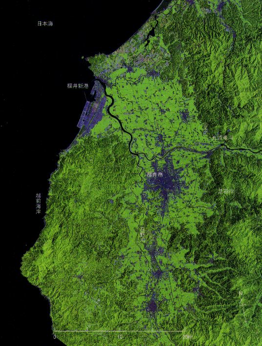 画像は,福井平野を中心とした嶺北地域で,福井県全面積の約4分の1に当たる。東西に流れる九頭竜川には,南の山あいから北流し,福井市の西で足羽川と合流した日野川が合流する。これら3大河川で潤う福井平野の昔は内海であったが,河川からの土砂の堆積で平野が形成されたのである。そのため,きわめて平坦である反面,肥沃,湿潤で排水が悪いのが特徴であり,福の井という県名の由来とも関連している。