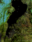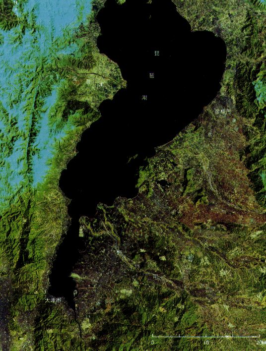 画像中央は日本最大の湖・琵琶湖(3,174平方キロ)で,滋賀県の6分の1の面積を占める。琵琶湖は今から数百万年前に断層陥没によってできたと言われる湖で,古来から人々に豊かな恵みをもたらしてきた。湖には,安曇川・姉川・愛知川・野洲川など大小120余りの河川が流入し,約275億トンの水を湛えながら南端の瀬田川から一筋の流れとなって大阪湾に流れ出る。湖の水が全部入れ替わるには約19年かかるといわれ,近畿1,300万人の飲料水源として,また農業用水,工業用水として利用されている。
