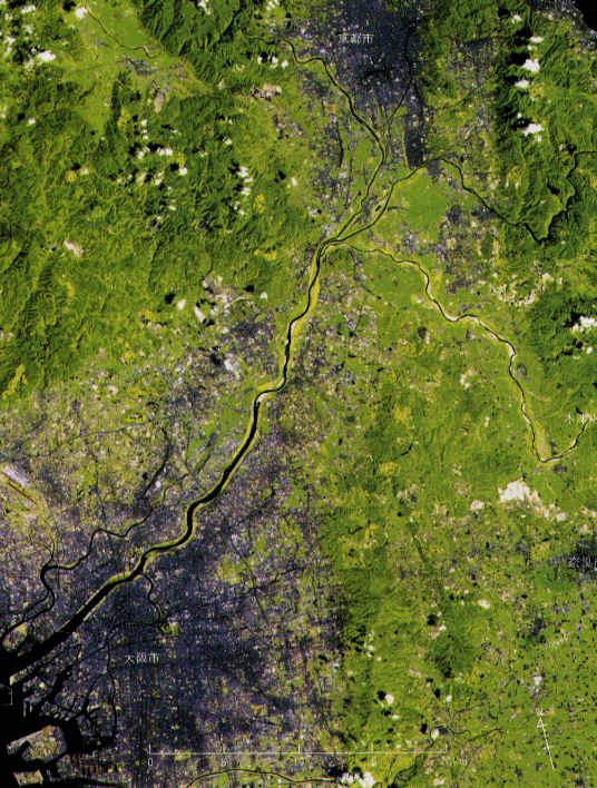画像は,大阪府,京都府南部,奈良県北部を中心とする近畿圏の都市近郊農業地帯をとらえている。画像中央やや上で桂,宇治,木津の三川が合流した淀川が,画像の中央を流下して大阪湾に注いでいる。この淀川の流域に耕地が拓かれ,洪水害と干害に耐えるための土地改良を行うことにより,長い歳月をかけて近畿圏の豊かな農業生産基盤を築き上げてきた。この地域は,高度経済成長期以降商工業の立地に拍車がかかり,農業以外の産業基盤や京都,大阪等への通勤者の居住空間としても多様な発展を遂げてきた。画像左側中央部の大阪国際空港や縦横に走る高速道路網が,この間の地域の変貌を象徴している。