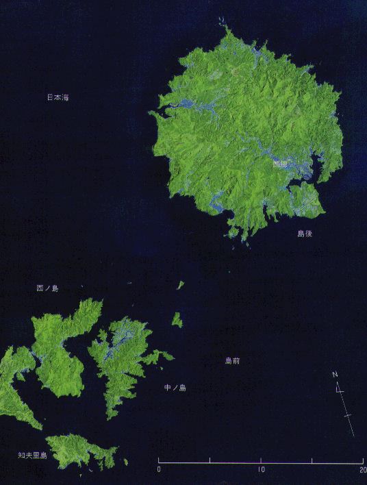 隠岐は島根半島の沖,44キロメートルから80キロメートルにかけて散在する群島である。画像で見るとおり,大きな4つの島と多数の小さな島からなっている。島の総数は,正確には数えられない。島の人に聞いても,「小さな島とするか岩とするか,満潮時と干潮時でもずいぶん違うんです」と,困惑げな答えが返ってくる。行政機関の資料には180余の小島からなると記されている。