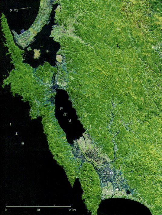宍道湖は大橋川,天神川を通じて東の中海に,さらに佐陀川を通して日本海に出る。佐陀川は江戸時代に水害を防ぐために作られが,運河としても使われ,低湿地であった沿岸地域を穀物地帯に変えた。画像では水を張った水田が濃い青で撮し出されている。