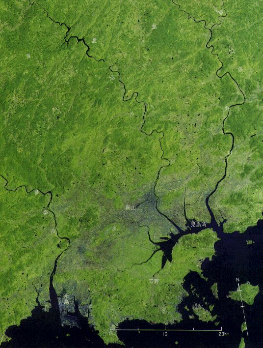岡山市の南の児島湾では,干拓地の水利問題を解決するために湾を締め切って児島湖がつくられた。画像上では1,600メートルの締切堤防もはっきりと判読できる。現在は湖は淡水化し,農業用水などに利用されている。さらにこの湖の背後には藤田,灘崎,玉野地区の大きな区画をもつ圃場が撮し出されている。この大きな区画配置が農業の機械化の先鞭をつけ,農業先進県として知られるきっかけとなった。
