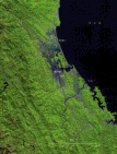 高知市から物部川河口にかけての暗緑青色の広がりは,4月中旬に田植えした早期作水田である。この地域ではかって水陸2期作が行われたが,減反政策下の今日では8月初旬の収穫後,野菜作または超晩播大豆へと続く。仁淀川河口近くも同様である。一方,物部川河口から上方,白く見えるのは,まだ水の入っていない晩期作水田である。高知市,南国市,安芸市を含むこの両地域は,ハウス園芸のメッカで,ビニールハウス群は,集落と混在しながら,海浜砂地を浦戸湾口付近へと連なる。
