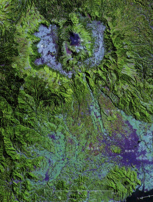 さて,阿蘇山の火口周辺は溶岩に覆れ,濃紫色に見えている。この色はまた市街地のコンクリートジャングル(例えば熊本市中心部を参照)ともよく似た反射をしているため,しばしば誤判読の原因となり解析する者を悩ませる。阿蘇山の阿の字のすぐ左には白い噴煙が見えている。その左側にしゃれこうべのように見える部分が,観光地として有名な草千里のシバ原である。阿蘇外輪山の内側には二つの谷が含まれ,灰色がかった水色の水田が広がっている。北側が阿蘇谷,南側が南郷谷である。この時期,どちらの谷も稲の収穫はすでに終わっているが,阿蘇谷の水田は基盤整備が済み,碁盤の目のような農道が東西南北に走っているのに対し,未整備の南郷谷では小さな水田が思い思いの方向に散在している。