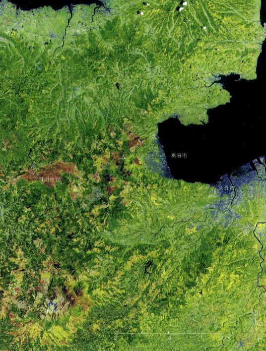画像は大分県の中央部を撮し出している。この地域は,北から南へ北東から南西に広がる3つの地域に区分される。