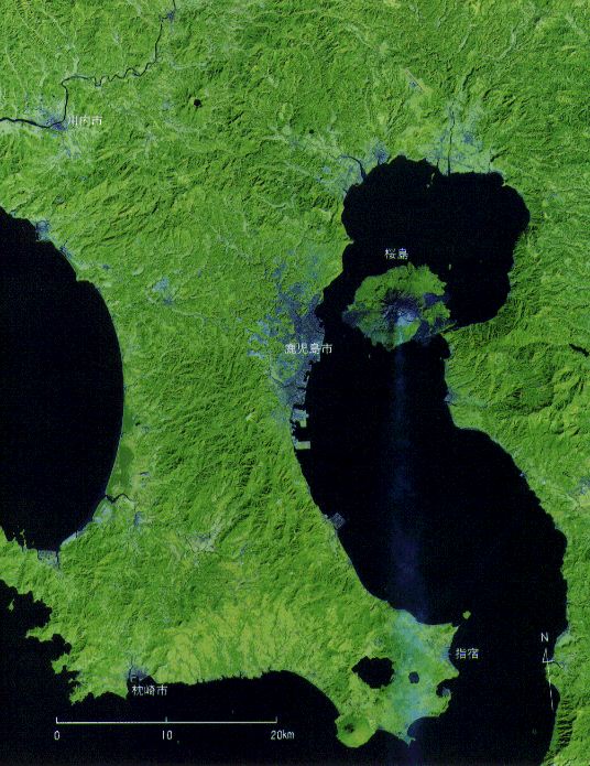 画像は10月22日に観測したもので,薩摩半島と大隅半島の一部をとらえている。左上部に蛇行する河川が,宮崎県に源を発する川内川である。そして,湾奥に流入する天降川と別府川,半島の尾根から東シナ海に流れる万之瀬川が代表的河川である。水田はこの流域と支流域,また,シラス台地を侵食してできた中小河川沿いに分布する。画像の灰緑色に見える帯状のものがそれである。残る部分が山林と畑地である。鹿児島県の耕地面積は143千ヘクタールであり,その内96千ヘクタールが畑地で,畑地率は67%(全国2位)と高い。画像から,鹿児島県でいかに畑地を中心とした農業が営まれているか再認識する。