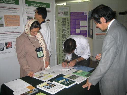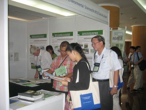 農業環境技術研究所では、カドミウムや有機ヒ素汚染土壌の修復や放射性同位元素モニタリングなどの研究を進めています *。これらの研究は、微量元素生物地球化学国際会議の主要テーマでもあります。そこで、当研究所は今回の国際会議の共催団体に加わり、会議を支えるとともに、研究所の展示ブースを設け、研究所の成果の広報を行いました。展示ブースには多数の参加者が訪れ、農環研の研究成果や英文出版物に興味を示していただきました。NIAES Annual Report 等の英文資料の配布も行いました。また、当研究所から2課題の講演発表と4課題のポスター発表を行い、いずれも高い関心を集めました。