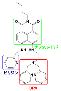 NMRと質量分析の結果から、カドミウムとの結合様式は ジ−2−ピコリルアミン(DPA:赤囲み部分)の3つの窒素で配位し、ピリジン(青囲み部分)とカドミウムが、 π-d軌道相互作用していることが推定された。このピリジン部分を他のピリジン化合物に置換したところ、亜鉛とカドミウムの蛍光スペクトルの差が見られなくなることから、ピリジンと金属との空間的な配置が重要であることが分かった。また亜鉛では、ナフタルイミド(緑囲み部分)のアミノ基が脱プロトンを起こし、窒素で配位していると考えられた。