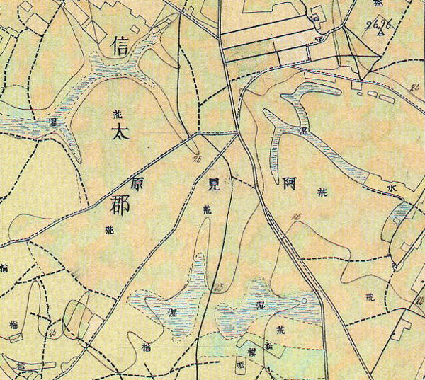 この地図の上で、例えば阿見原を見ると、茶色と緑のまだら模様で色づけされ、さらに 「荒」 という文字が書かれています。高見原や女化原も、似たような色で塗られ、「灌(かん)」 という文字や 「草」 という文字が書かれています。これは、そこが低木や草地などの 「原野」 だったことを示しています。つまり、「○○原」 という地名の場所は、昔は原野だったのです。