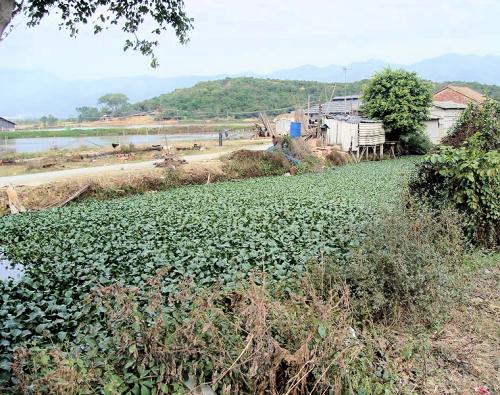 21日は近郊の農家を訪問し、アレロパシー現象の見学会がありました。Xhaoqing 市の農家では、アレロパシー活性のある被覆植物によるパパイヤ畑でのリビングマルチが試みられていました。しかし、農地の周辺にナガエツルノゲイトウ、ランタナ、ホテイアオイ(写真3)などの侵略的外来植物がまん延しているのが気になりました。