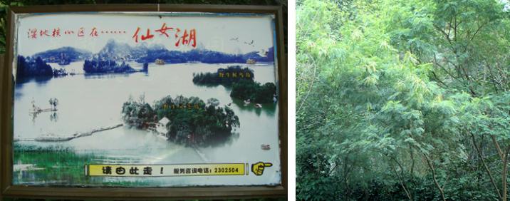午後は Dinghushan(鼎湖山)自然保護区で植生に関する実験サイトを見学しました。仙女湖の湿地生態系保存島と七星岩という景勝地も見学しましたが、周辺の山にはギンネムが旺盛(おうせい)に生育しており、生態系保全との両立が懸念されました(写真4)。