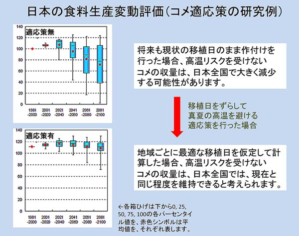 これまでの研究の結果、コメについては、夏の高温を避けるために移植(田植え)日をずらす適応策により、日本全国では高温による品質低下のリスクを避けることが可能と考えられます。