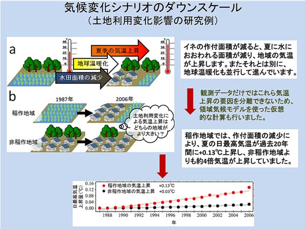 図2 1987年の時点で水田を含む地域を「稲作地域」、それ以外の地域を「非稲作地域」とし、これらの地域の過去20年間の土地利用変化による気温上昇を、領域気候モデルを用いて比較