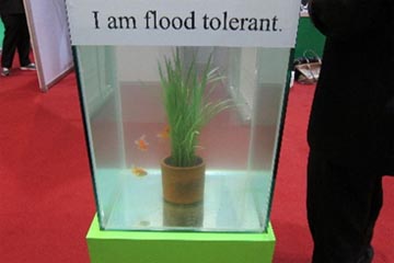 <浮稲(うきいね)>国際イネ研究所(IRRI)のブースでは、イネの環境適応を紹介する展示がありました。乾燥、塩害そして深水などへの適応です。写真は金魚が泳ぐ水槽の中にイネを沈めた深水耐性の展示です。東南アジアには、雨期に水田の水深が深くなっても稈(茎)を長く伸ばして深水にも対応できる浮稲というイネがあります。