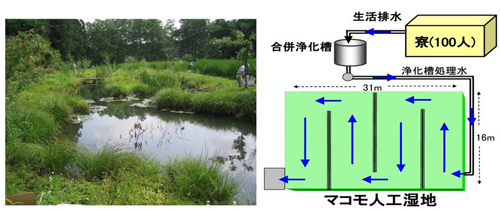 下水道のないところでは合併浄化槽というもので生活排水を処理していますが、よごれの大部分である有機物は微生物で比較的よく処理できますが、水質を悪化させる窒素やリンの化合物は水に溶けたまま出て行ってしまいます。そこで、その排水を人工湿地で浄化する実験をしています。