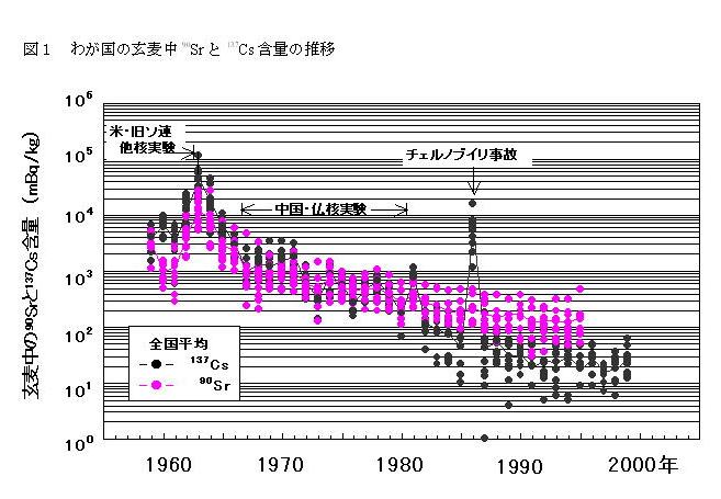 - 玄麦中の137Csレベルは,大気圏核実験が行われていた1963年に最大値43,600mBq/kgに達し,その後1985年には45mBq/kgまで減少した。1986年,チェルノブイリ原子炉事故によりその年度のみ 5,960mBq/kgレベルまで上昇した。しかし,その後減衰し続け,現在では30mBq/kg以下の濃度となっている(図1)。