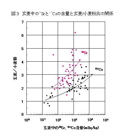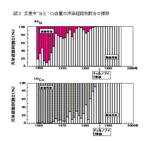 - 玄麦中の90Srレベルは,1963年に最大 12,300mBq/kgを検出した。チェルノブイリ原子炉事故に際して汚染レベルの上昇は観測されなかった。その後,濃度は 200mBq/kg以下と横ばい状態で現在に至っている(図1)