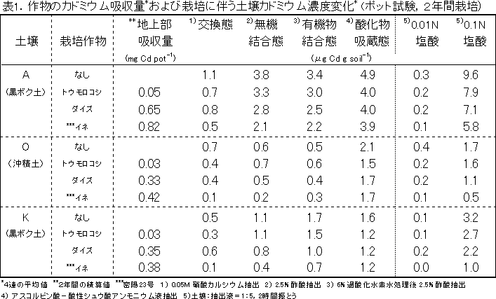 - 栽培後,土壌のカドミウムは,イネ区において他の作物区と比較して交換態,無機結合態だけでなく有機物結合態といった難溶性画分及び0.01N,0.1N塩酸抽出画分が著しく減少した。このことから,汚染水田土壌の修復作物としてイネが最適であることが示された(表1)。