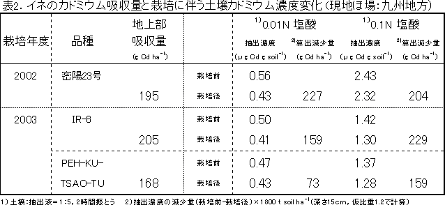 - 九州地方の現地ほ場におけるイネのカドミウム吸収試験において,密陽23号およびIR-8がPEH-KU-TSAO-TUより高い吸収量を示した。従って,