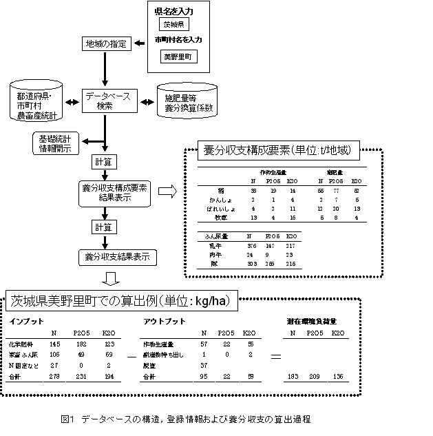 - データベースシステム(図1)は,地域名を入力することで,インプット量(化学肥料,家畜ふん尿,雨,灌漑水,窒素固定)とアウトプット量(作物生産量,副産物持出し量,脱窒)を算出し,農地での養分収支を表示する。ここで示される過剰な養分は,潜在的な環境負荷量である。