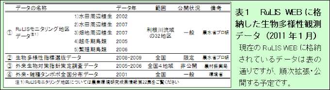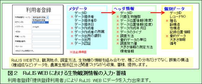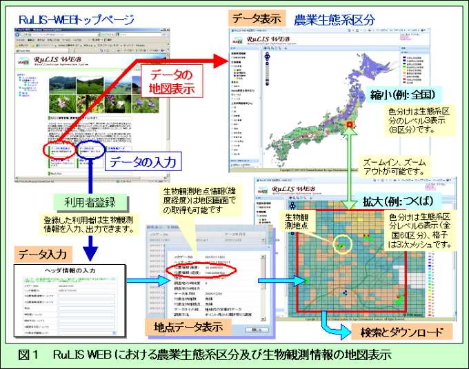 - RuLIS WEB(URL;http://rulis.dc.affrc.go.jp/rulisweb/)では、農業景観調査情報システム(農業環境研究成果情報第22集)のフレームを踏襲し、全国の農業生態系区分と地点ごとの生物多様性観測情報をWeb-GIS(地理情報システム)上でリンクし、それらを表示、提供(ダウンロード)することができます(図1)。RuLISはRural Landscape Information Systemの略です。