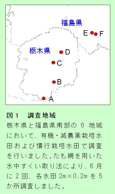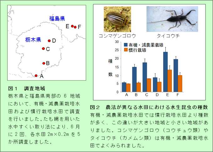 - 栃木県から福島県南部にわたる6地域(図1)のそれぞれにおいて、農法の異なる水田(有機栽培または殺虫剤を使わない減農薬栽培と殺虫剤などの農薬を使う慣行栽培)を選定し、水生昆虫(ゲンゴロウなどのコウチュウ類、アメンボなどのカメムシ類、トンボ類(ヤゴ))の種類および周辺(5km×5kmの範囲)の環境を調べました。