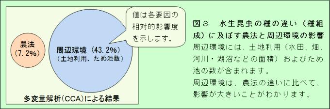 - 水田は、水辺の生物にとって、重要な生息場所と言われています。農地やその周辺に生息する生物を保全することなどを目的に、環境に配慮した農業(環境保全型農業)の普及が図られています。しかし、このような農業が生物の保全にどのくらい効果があるのか、またその効果は周辺の環境によって違うのかは、よくわかっていません。そこで、これらのことを明らかにするために、水田の農法および周辺環境が水生昆虫の種数に及ぼす影響を調べました。