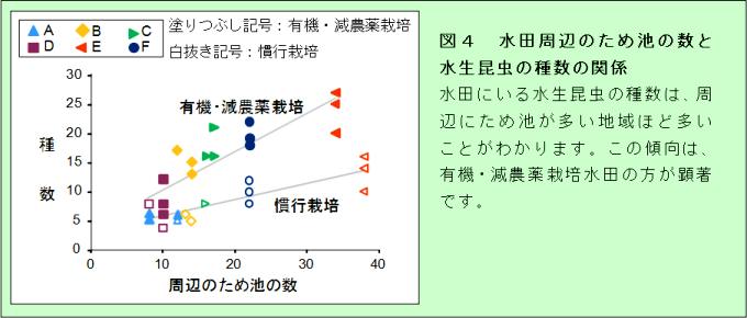 そこで水生昆虫の種の違いに対する農法と周辺環境の影響を多変量解析により調べた結果、周辺環境の影響が大きいことがわかりました(図3)。次に周辺環境と種数の関係を解析したところ、周辺にため池が多い環境ほど水生昆虫の種数が多いことがわかりました(図4)。ため池は、水田の休閑期や落水期に、水生昆虫の生息場所となります。