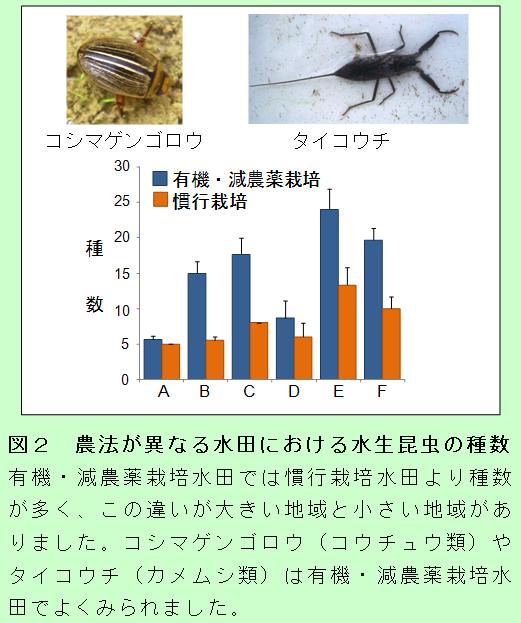 - 有機栽培および殺虫剤を使わない減農薬栽培は、水田に生息する水生昆虫の種数を増やす効果がありました。その効果の大きさは、水田周辺の環境によって違い、周辺にため池など水生昆虫の生息場所が多く、種が豊富な地域で効果が高くなりました。