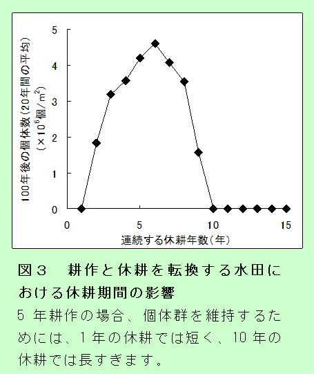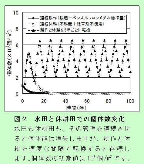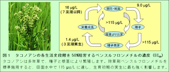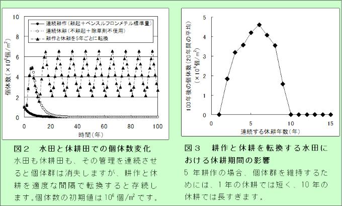 - 準絶滅危惧植物であるタコノアシは、水田、休耕田ともに、それぞれの管理を続けると消失しますが、耕作と休耕を転換すると存続します。河川では、除草剤の水中濃度のほとんどが存続可能な範囲に収まっており、増水による撹乱が中程度であれば存続します。