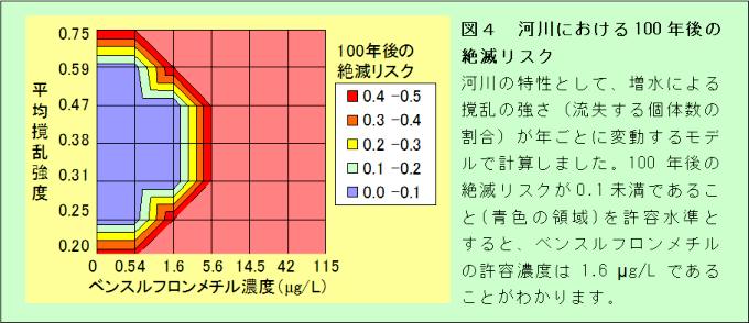 標準量のベンスルフロンメチルを連用する水田(処理濃度115μg/Lの個体群動態モデル)では、耕起と除草剤の影響で個体群が急速に消失します(図2)。不耕起で、除草剤を全く使用しない休耕田(無処理区の個体群動態モデル)でも、休耕を続けると自然遷移が進むことにより個体群は消失します。ところが、耕作と休耕を適度な間隔で転換すると100年後も個体群が存続するようになります。ただし、耕作期間を5年とした場合、休耕期間が1年では短く、10年では長すぎることに注意が必要です(図3)。河川では、増水による撹乱が中程度(平均して、毎年、個体数の3割〜5割が流される程度)であれば個体群は存続します。また、100年後の絶滅リスクが0.1未満であることを許容水準とすると、ベンスルフロンメチルの許容濃度は1.6μg/Lであることがわかりました(図4)。これまでの報告では、ほとんどの河川がこの許容範囲に収まっており、河川におけるベンスルフロンメチルの影響は無視できるレベルであると評価されました。