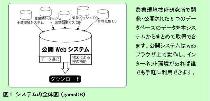 - WebシステムgamsDB (Ghg Agro-stat MeteoCrop Soil-information Data Base, http://agrienv.dc.affrc.go.jp/) には、これまで農業環境技術研究所で収集・整備してきた気象、土壌、農地利用、温室効果ガスの各種データが収録されており(図1)、それらを基準地域メッシュ(3次メッシュ、約1km×1km)、および測定地点単位で取得することができます。ユーザ登録等の手続きは不要です。