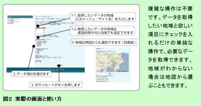 - データを取得したい3次メッシュのコードや、測定地点の名称がわからなくても、該当する位置をGoogleMapから選択することができます(図2)。