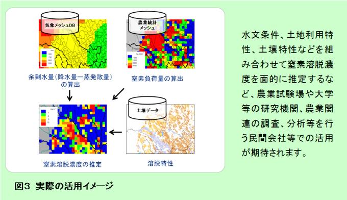 - 取得できる情報はテキスト形式のファイルなので、GISソフト等で容易に利用できます。複数のデータを組み合わせて窒素等の養分溶脱量を推定する(図3)など、様々な分野での活用が期待できます。