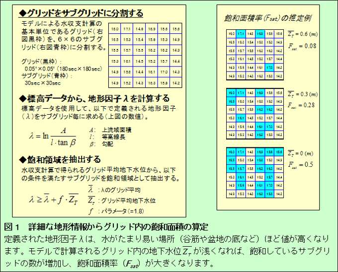 - 構築したモデルは0.05°×0.05°(約5km×5km)の解像度のグリッド(格子)単位で水収支が算定できる分布型水文モデルであり、地形や土壌物理性の情報と、日別の気温、降水量、日射量、湿度、風速から、蒸発散量や層別の土壌水分量、地下水位等が計算できます。その際、グリッド内の詳細な地形情報を指標化することにより、グリッド内の土壌水分の不均一性や地表面飽和領域の面積(飽和面積)を算定できます(図1)。