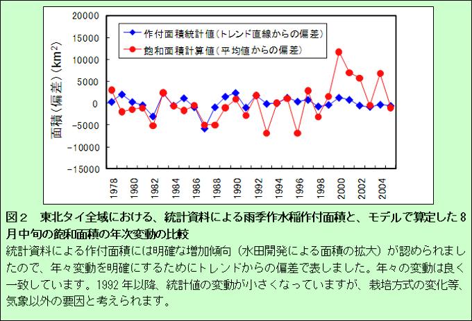 1979年から2005年までの期間についてモデルを実行し、得られた飽和面積を東北タイの天水田地帯について旬ごとに集計し、統計資料から得た各年の作付面積と比較した結果、8月中旬の飽和面積と作付面積の相関が最も高くなることがわかりました(図2)。これは、この地域では日長感応性が強い品種が作付されており、水稲作付は遅くとも8月末頃までに実施する必要があることを反映していると考えられ、この時点での飽和面積により水稲作付面積が適切に推定できる可能性が示されました。