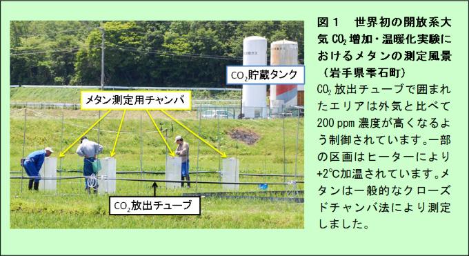 - 水田は強力な温室効果ガスであるメタンの主要な発生源の一つです。地球の気候変化を予測するためには、現状のみならずメタン発生量を将来にわたって推定することが必要です。本研究は人間活動によってもたらされている大気CO2の増加や地球温暖化が、水田からのメタン発生量に及ぼす影響を把握することを目的としました。