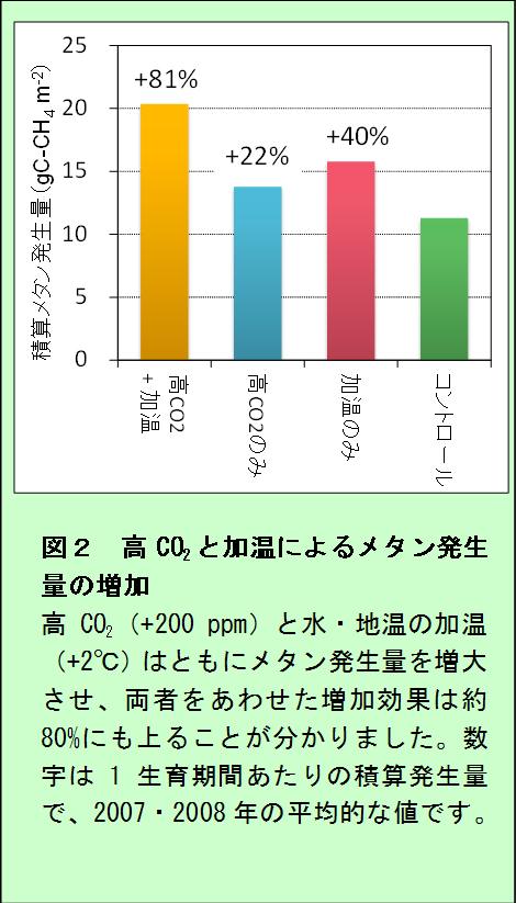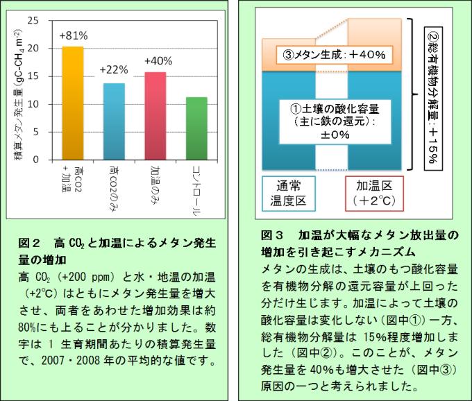 イネ生育期間中のCO2・温度上昇は水田からのメタン発生量を大幅に増加させる
