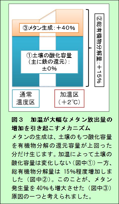 これまでの知見通り、高CO2はイネの光合成促進と根圏への有機物供給量を増やすことでメタンを増やすと考えられました。一方、+2℃の水・地温の上昇はメタン発生量を40%も増加させました(図2)。その要因を解析したところ、i) 生育前半は土壌の酸化容量を超える有機物分解が加温により大幅に増えたこと(図3)、ii) 生育後半は加温がメタンの基質となるイネ根の老化・分解を促進すること、が重要なメカニズムであると示唆されました。これらの成果は水田からのメタン発生量予測と将来の気候変化予測を行う上で有用な知見です。