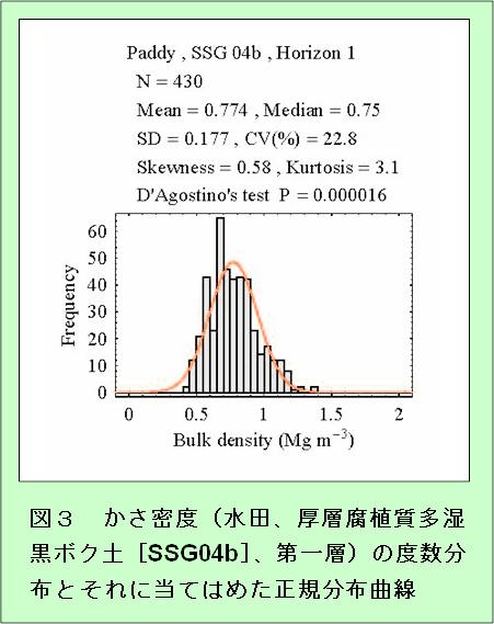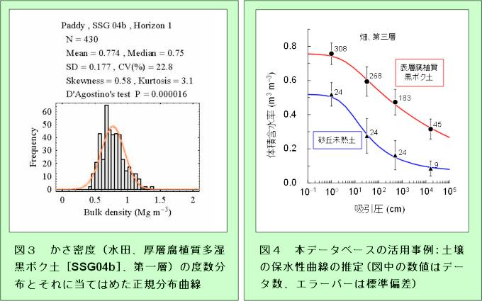 本データベースは、土壌の基本的な物理的性質である17の調査・分析項目(図2)を、60の土壌統群別、最大で第六層までの層位別、5つの地目別に、収納しています。また、調査・分析項目毎の全国平均値、標準偏差、中央値、25および75パーセンタイル値といった基本的な統計値に加えて、度数分布図およびそれに当てはめた正規分布曲線のグラフ、度数分布の歪度および尖度、度数分布の正規性および対数正規性の検定結果も併せて掲載しました(図3)。国際的に見て大変貴重なデータベースであり、すべて英語で記載するとともに、国際的な土壌分類基準(FAO、USDA)との対応表も整備しています。これらの図表は、農業環境技術研究所のホームページ内のデータベースより、ExcelファイルおよびPDFファイルとしてダウンロードすることができます。