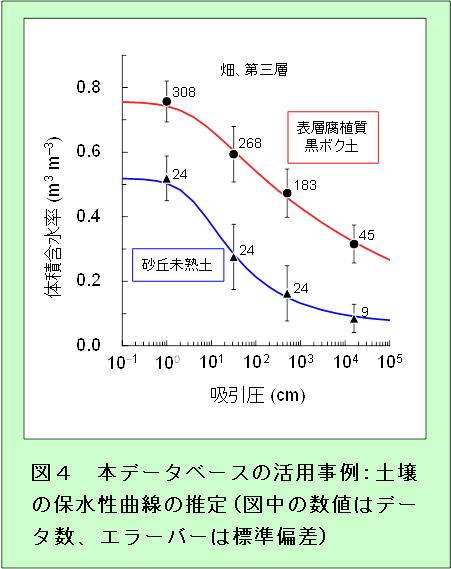 本データベースは、さまざまな土壌・地目における層位別の保水性・透水性に関わるパラメータの推定(図4)や、水移動にともなう環境負荷物質の輸送過程を解析・予測するための調査研究などに、利用することができます。