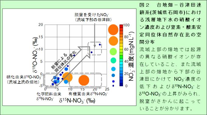 台地畑−谷津田連鎖系の地下水調査(図2)では、流域上部の畑地のδ18O-NO3-は硝化由来の硝酸イオンのδ18O-NO3-に近い値をとっていることから、脱窒があまり起こっておらず、結果として流域上部の畑地のδ15N-NO3-は起源の異なる硝酸イオンの同位体比を反映していると考えられます。また、化学肥料を起源とする硝酸イオンのδ15N-NO3-とδ18O-NO3-は直線的に変化しており、流域上部の畑地から下部の谷津田へと至る過程で脱窒を受けていることが確認されました。